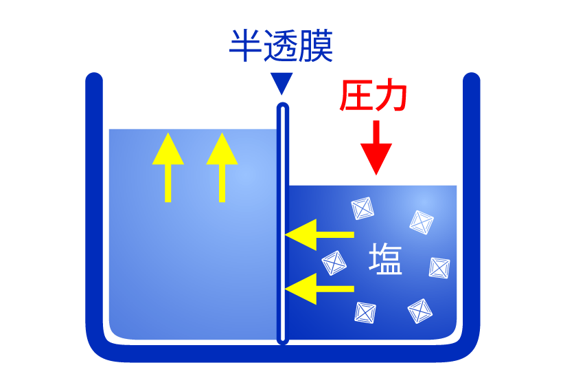 塩の入った水の方に圧力を掛けると、水だけが半透膜を通り、塩水は濃縮されていきます。通常浸透と逆の圧力を掛けることで生じるこの現象を逆浸透といいます。